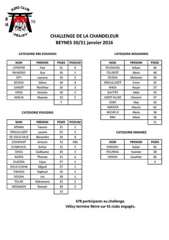 Vous trouverez en pièce jointe les résultats du challenge de la chandeleur de Beynes ou plusieurs judoka Véliziens participaient dans différentes catégories.